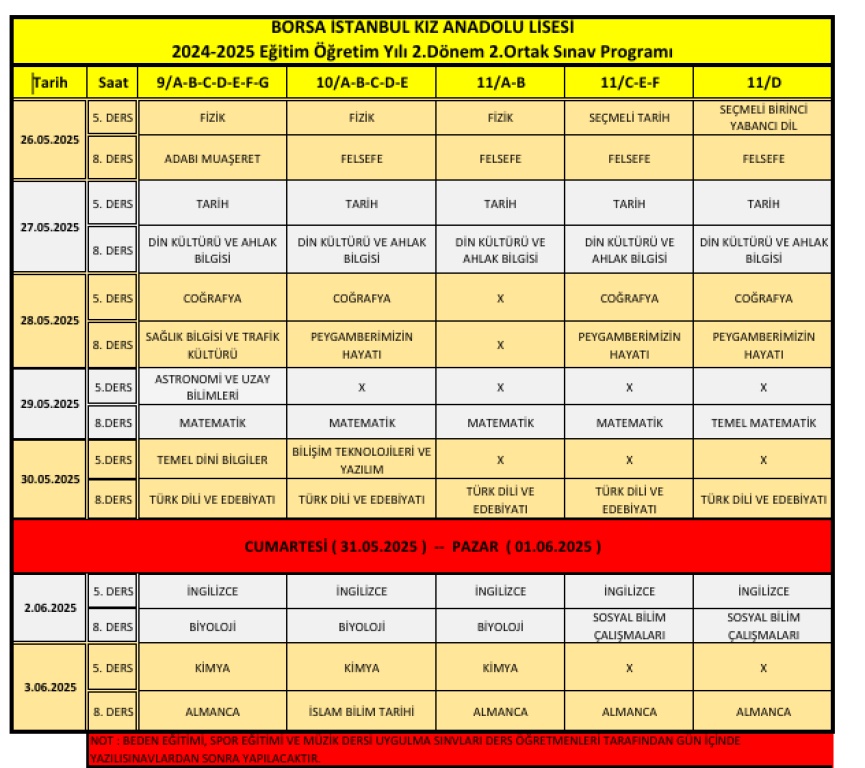 Okulumuz Borsa İstanbul Kız Anadolu Lisesi 2. dönem 2. sınavşarı 26 Mayıs- 3 haziran 2025 tarihleri arasında yapılacaktır.