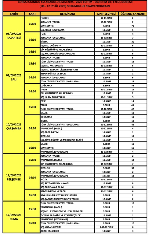 08-12 EYLÜL TARİHLERİ ARASINDA YAPILACAK "EYLÜL 2025 DÖNEMİ SORUMLULUK SINAVLARI " PROGRAMIDIR.
